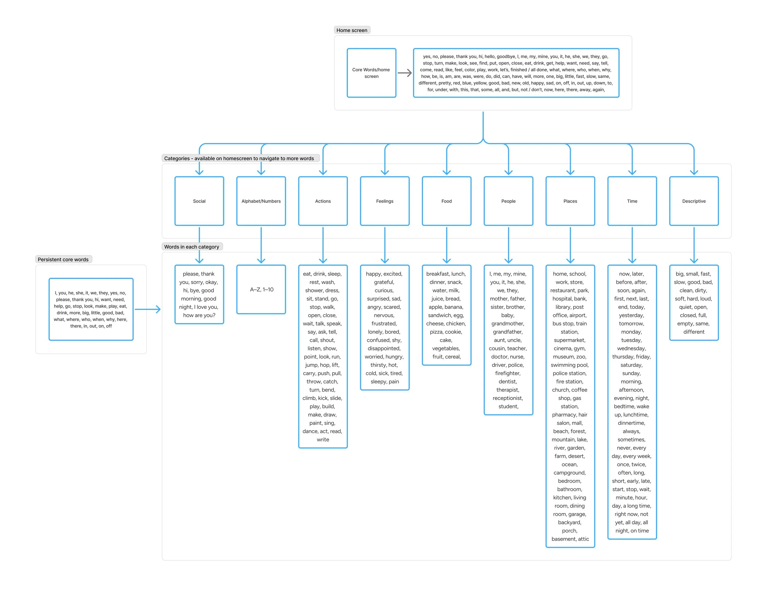 To create an intuitive and empowering communication experience, I built the vocabulary architecture using evidence-based AAC principles and user-centered research: