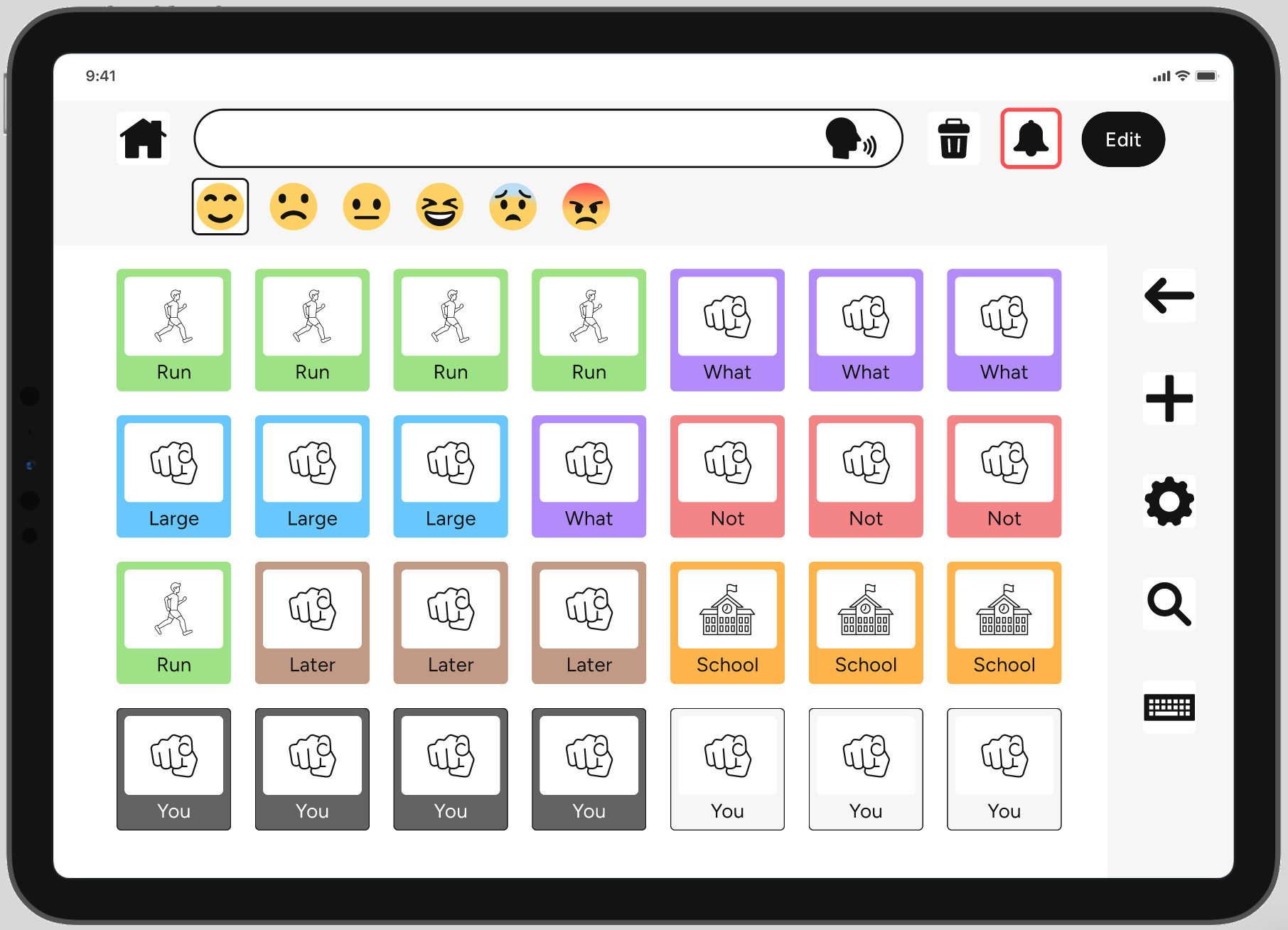 Vocabulary tiles use Modified Fitzgerald Key mappings to help users recognize word functions (pronouns, verbs, nouns, etc.)