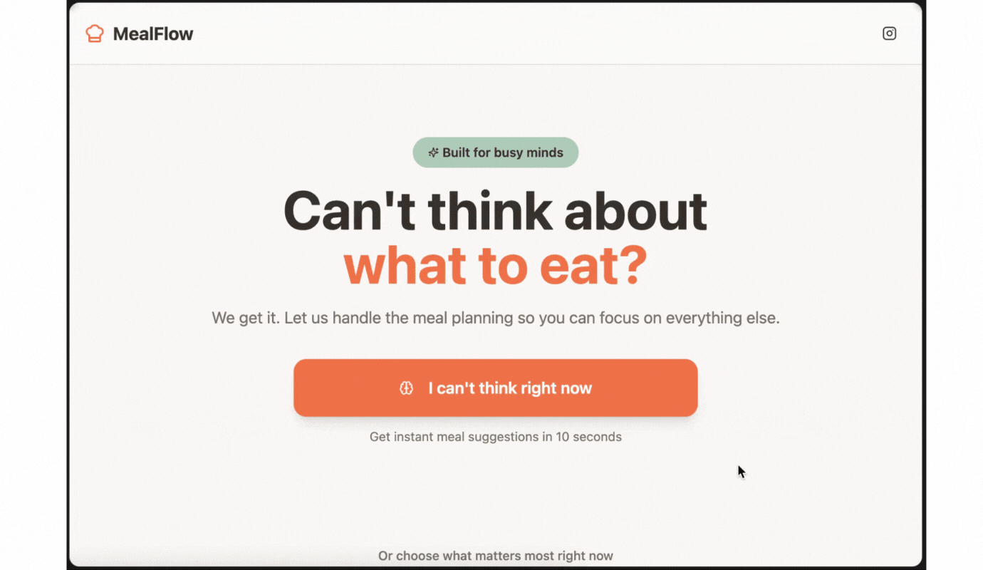 Create prototype for user flow for ‘I can’t think right now’ recipe suggestion
