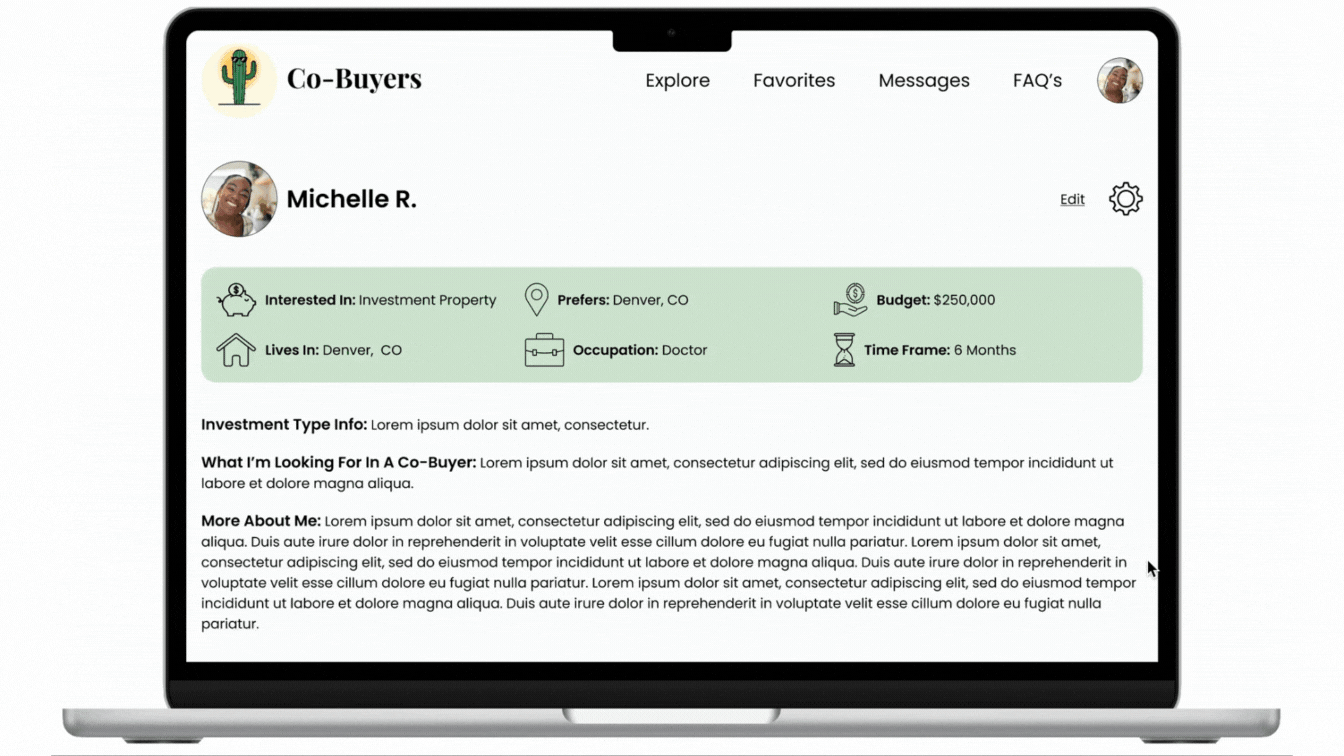The final major update from the low-fidelity to high-fidelity designs was the explore page, one of the most critical areas of the product since it’s where users browse potential co-buyers, view matches, and explore profiles. My goal was to create a seamless, intuitive experience that made it easy for users to quickly understand whether someone might be a good match.