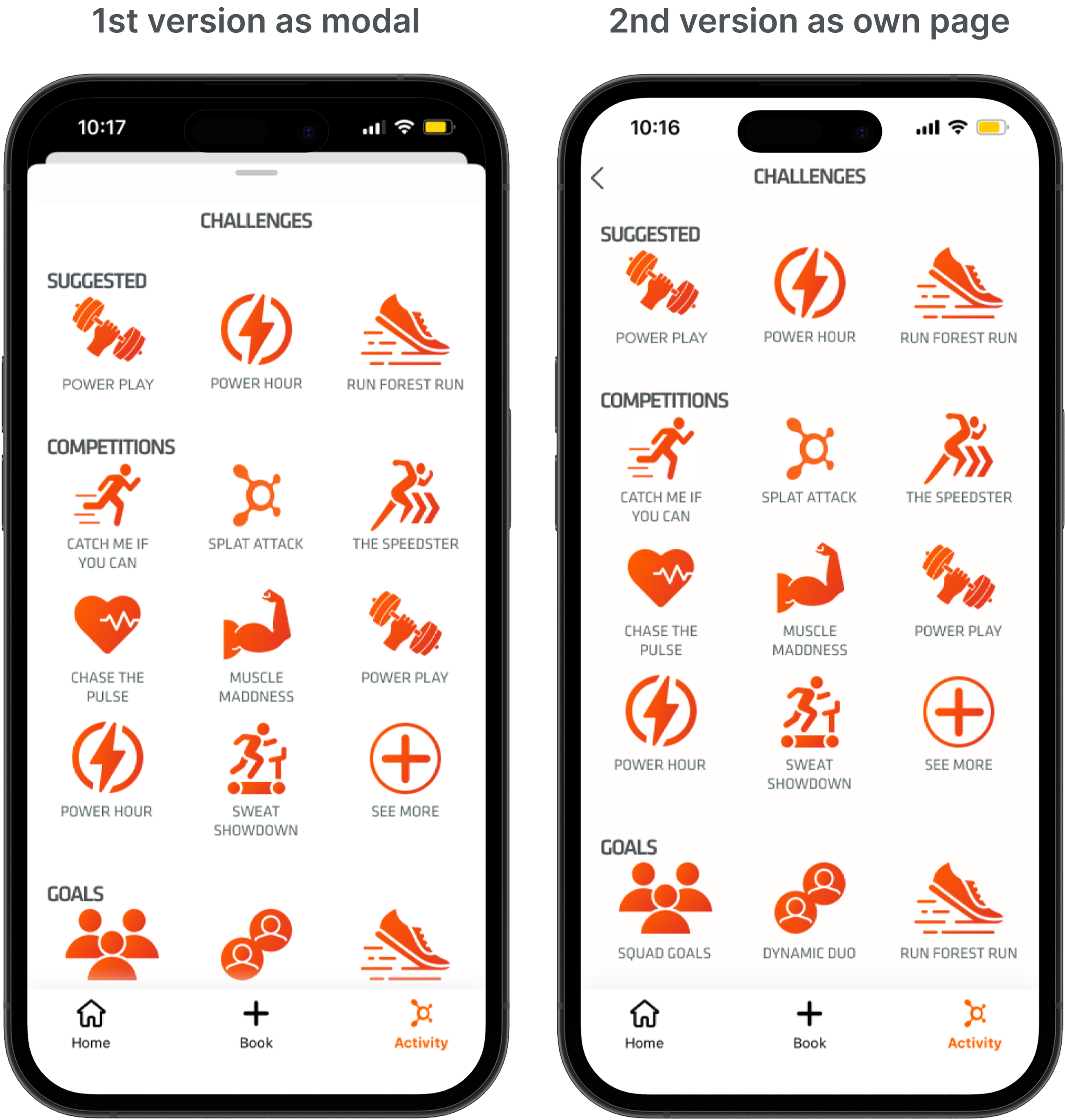 Originally, the 'Choose a Challenge' page was designed as a modal, but this led to excessive back-and-forth navigation when users explored different challenges and goals. To improve usability, I transformed it into a dedicated page featuring a modal pop-up that displays the challenge or goal description along with a 'Start Challenge' button when users click on a challenge or goal icon.